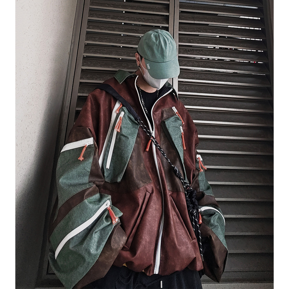 UUCSCC嘻哈高街翻领宽松拉链皮衣夹克美式潮牌拼接多口袋工装外套