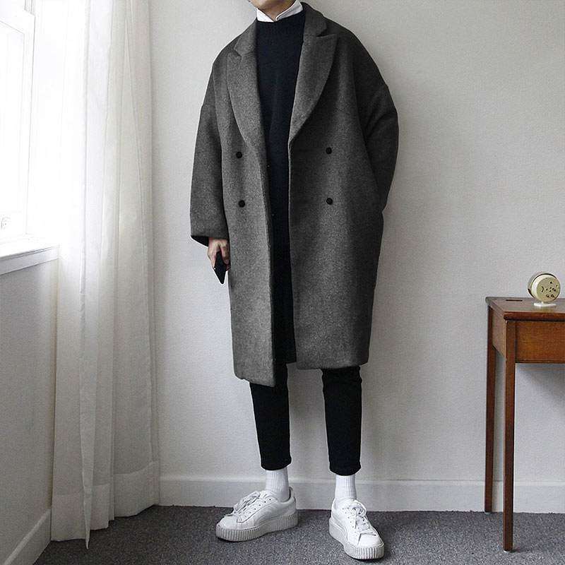 男装韩国中长款宽松加厚毛呢外套休闲深灰色个性帅气呢子大衣潮流