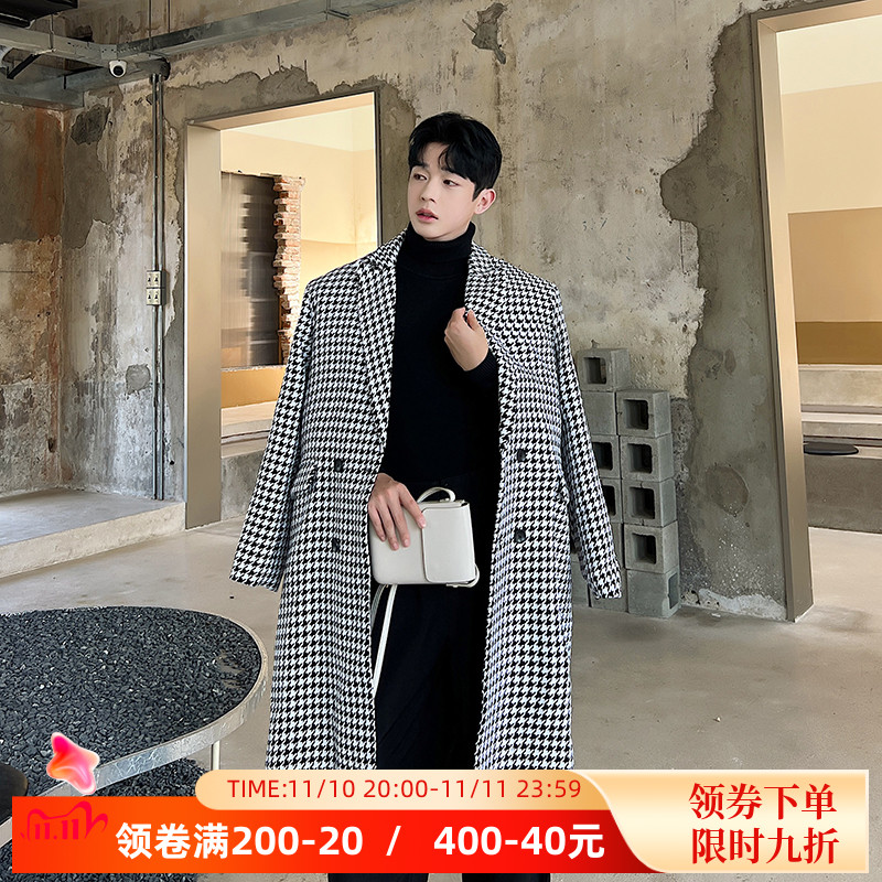 韩国东大门复古千鸟格呢子大衣男中长款过膝风衣外套气质宽松高级
