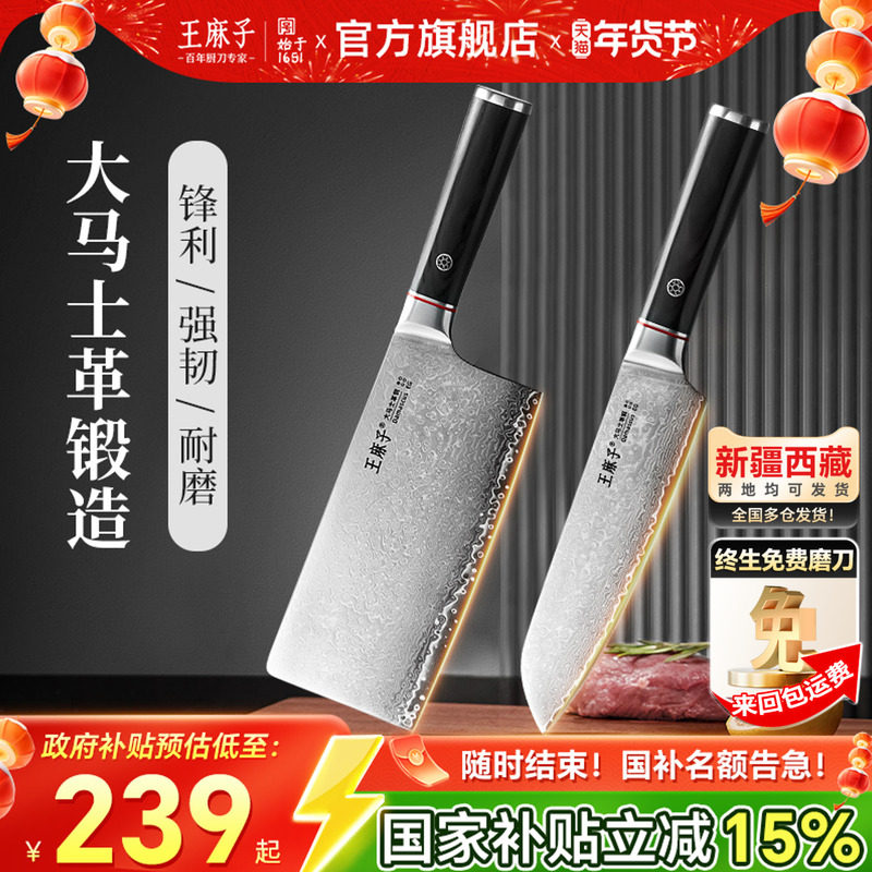 王麻子菜刀高端大马士革钢锻打刀锋利切菜片肉厨房刀具官方旗舰店