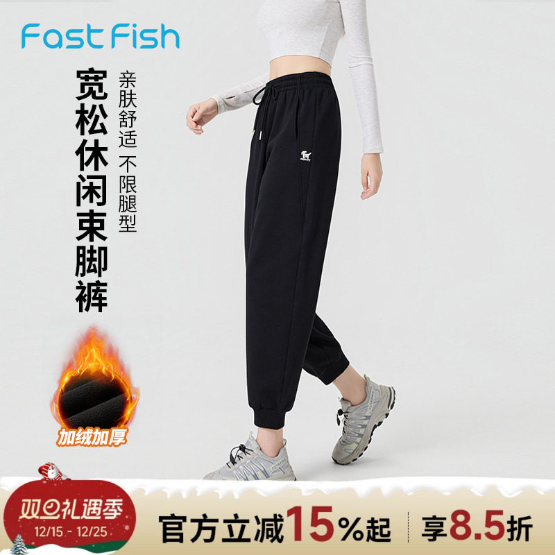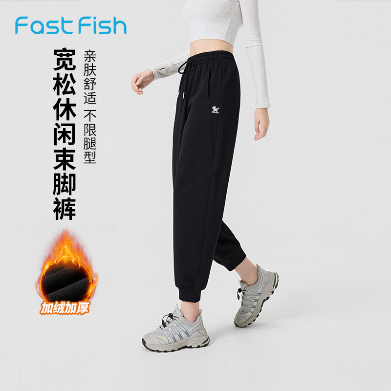 快鱼简约百搭加绒束脚裤女2025年冬季宽松加绒休闲裤运动长裤子