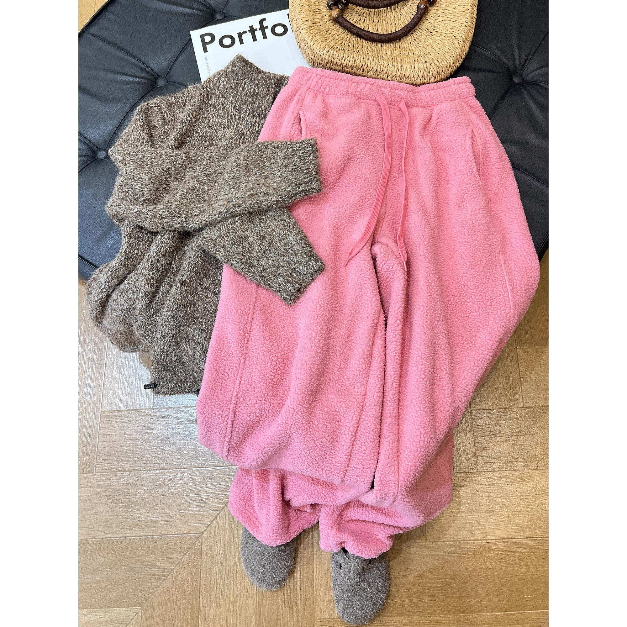 奥特莱斯~清仓外贸慵懒风粉色加绒加厚束脚裤女2025冬韩系休闲裤