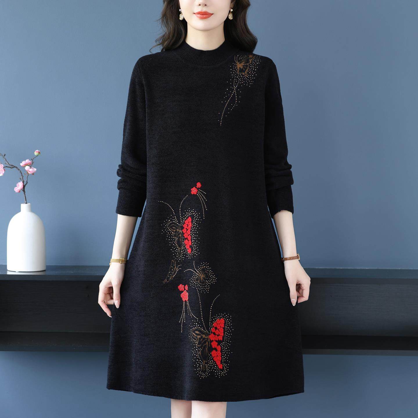 时尚休闲大码妈妈装针织连衣裙女冬装新款中长款加厚毛衣裙子中年