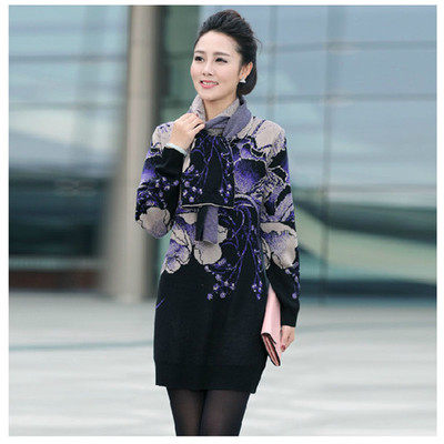中年妈妈秋冬装针织连衣裙女宽松大码洋气印花高贵长款毛衣打底裙