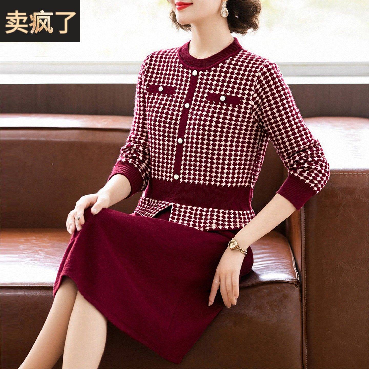 妈妈洋气毛衣连衣裙中年女装秋冬装中长款打底衫中老年千鸟格裙子