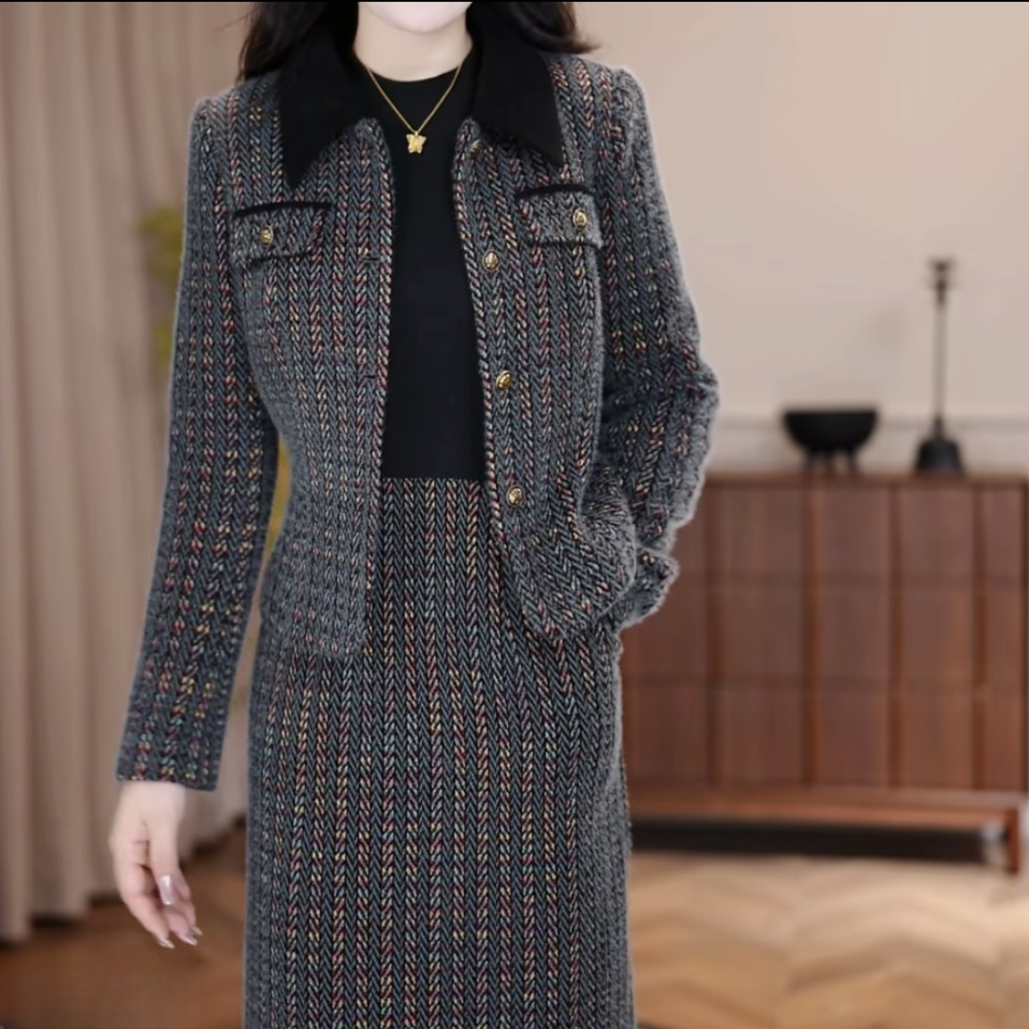 小香风毛呢短外套两件套连衣裙冬装新款中年妈妈修身减龄套装裙子