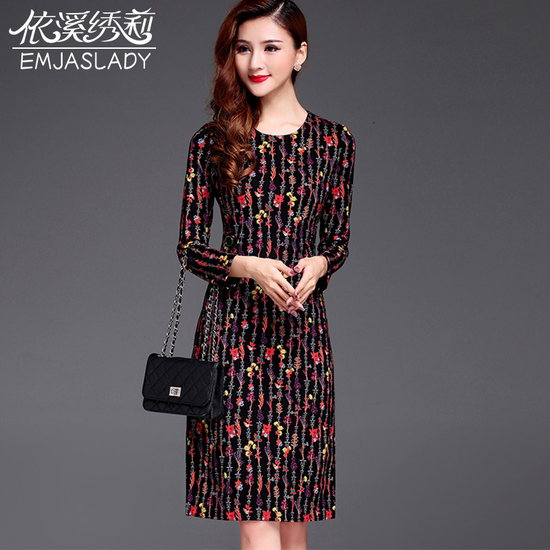 依溪绣莉2023秋冬装新款女装中年妈妈装修身印花长袖中长款连衣裙