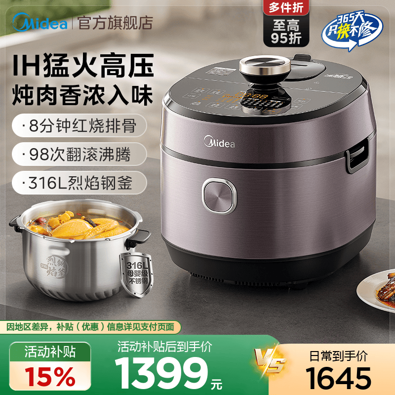 美的电压力锅0涂层家用IH双胆5L大容量智能预约高压锅电饭煲官方