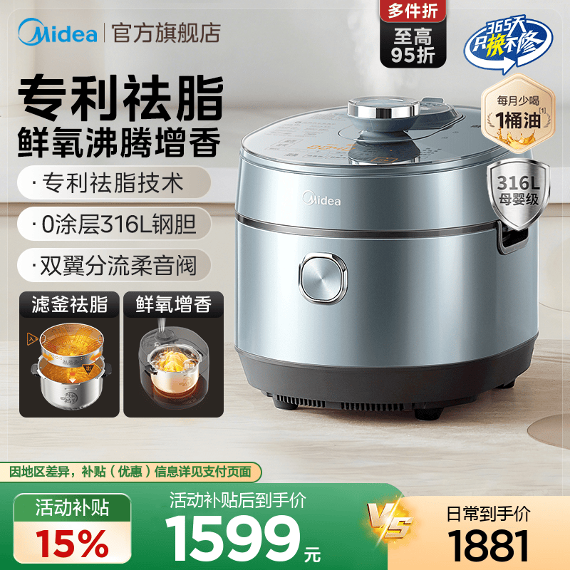美的低脂浓香电压力锅316L钢胆5L大容量双胆家用新款电饭煲官方