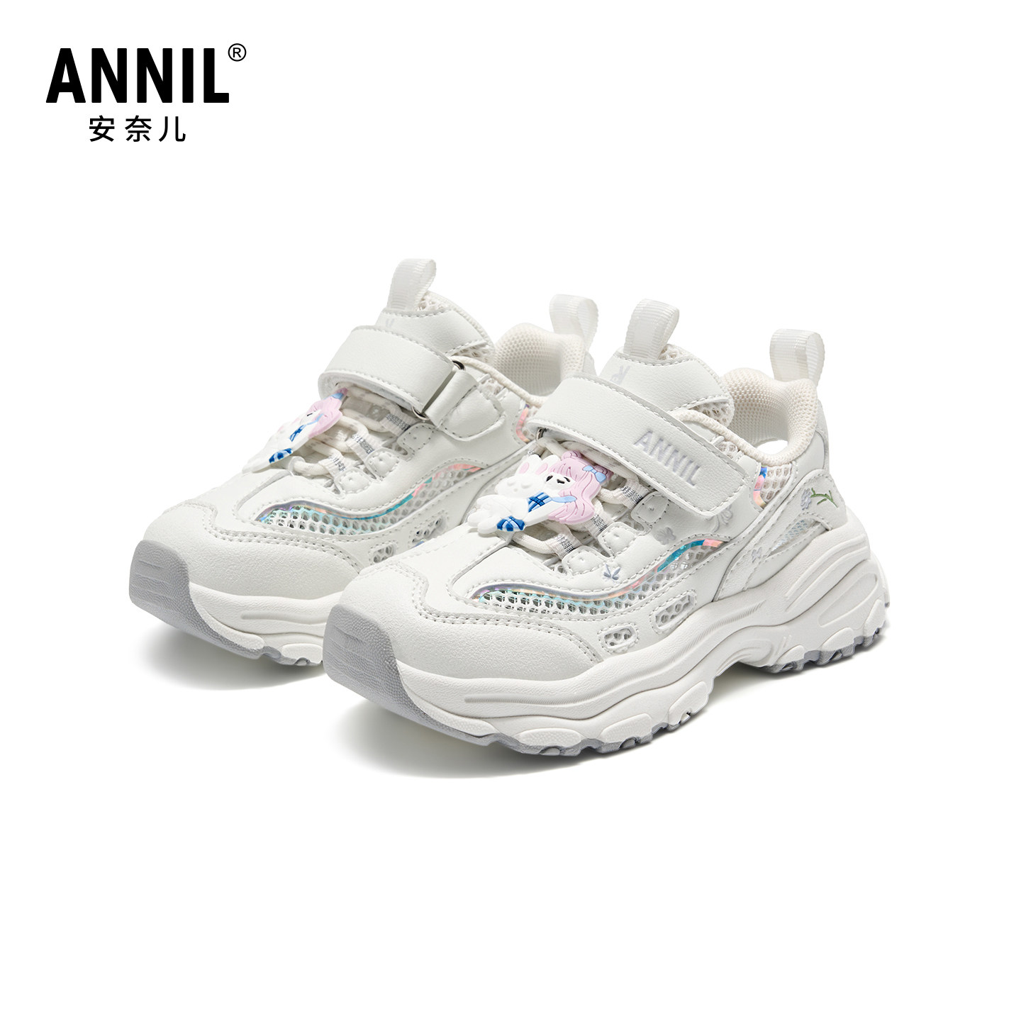 安奈儿儿童凉鞋女孩夏季软底白色镂空网鞋大童女童网面透气运动鞋