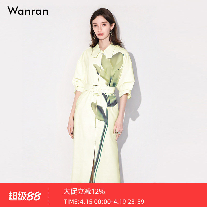 2026夏季新款气质翻领灯笼袖宽松系带定位印花鹅黄衬衣连衣裙