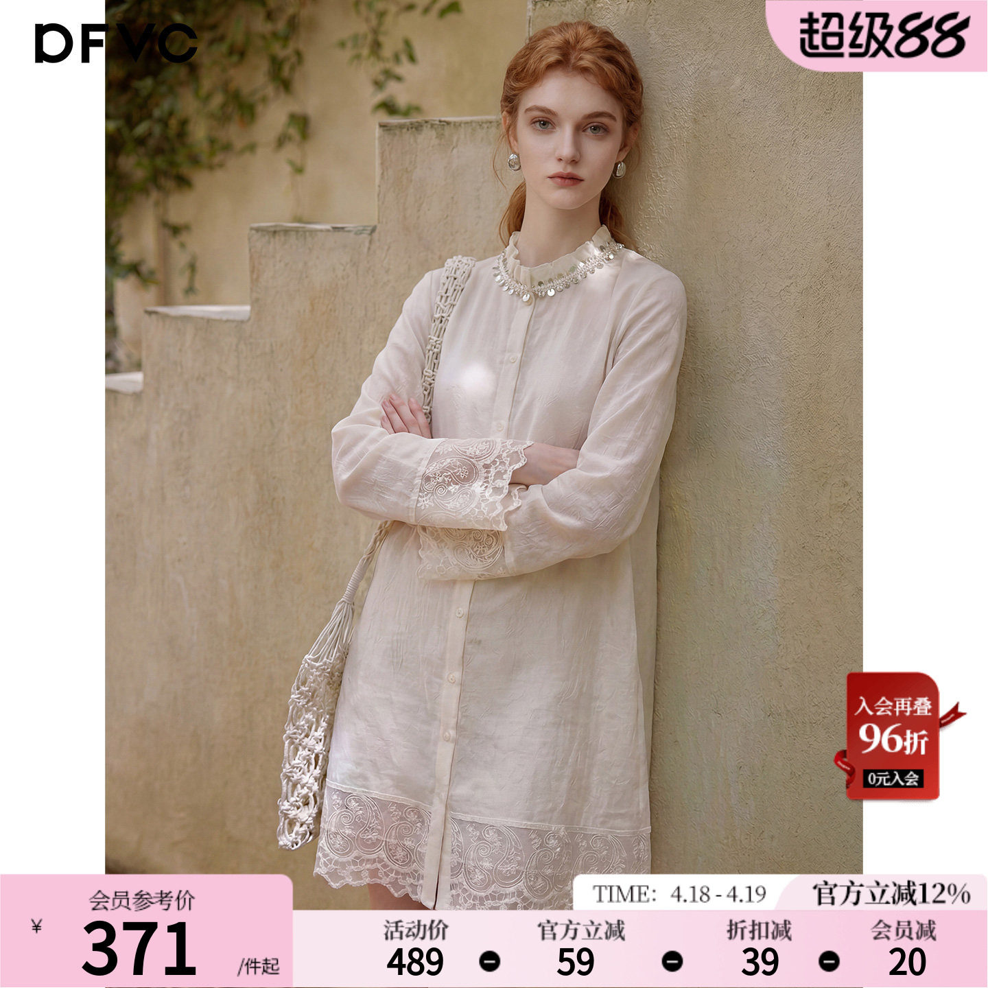 dfvc醋酸复古蕾丝拼接衬衫裙女2026年夏季新款长袖宽松中长连衣裙
