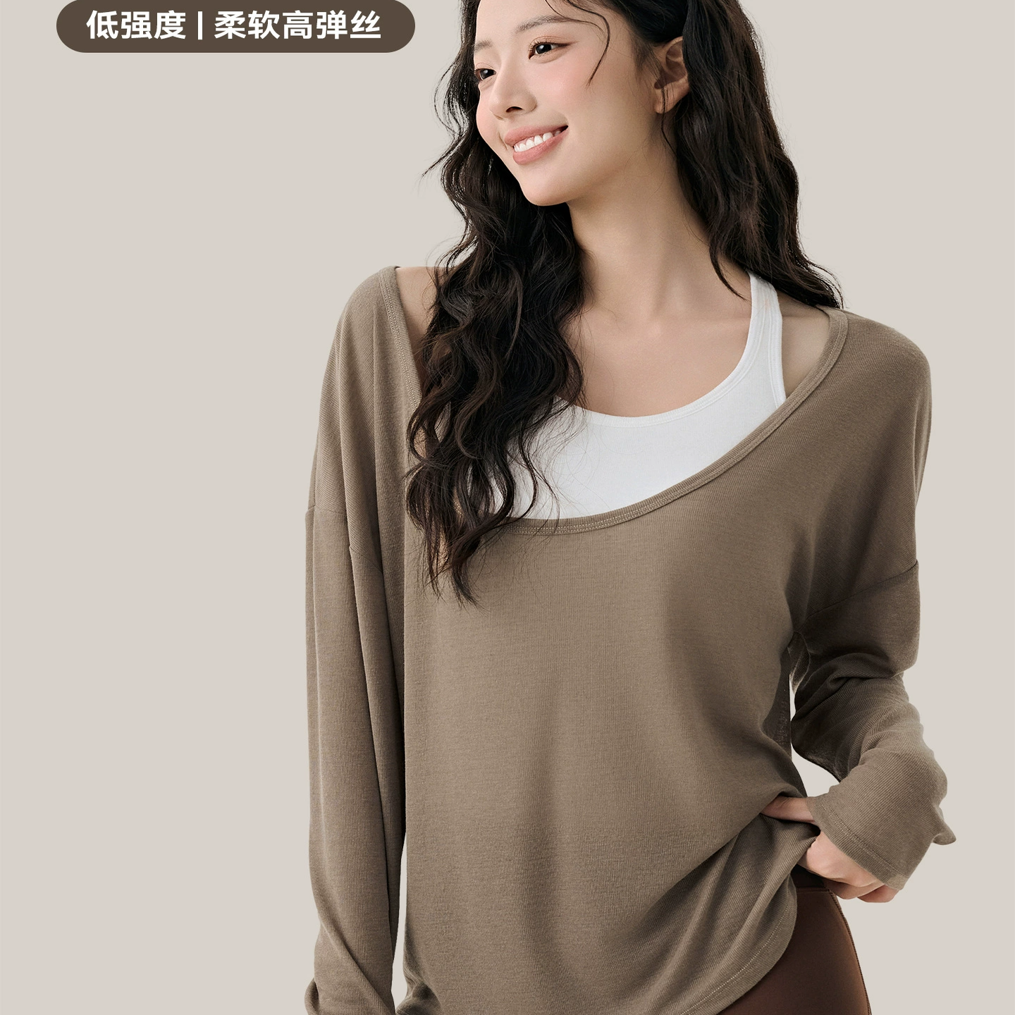 速干瑜伽服T恤女秋季新款圆领百搭宽松透气修身中长款长袖两件套