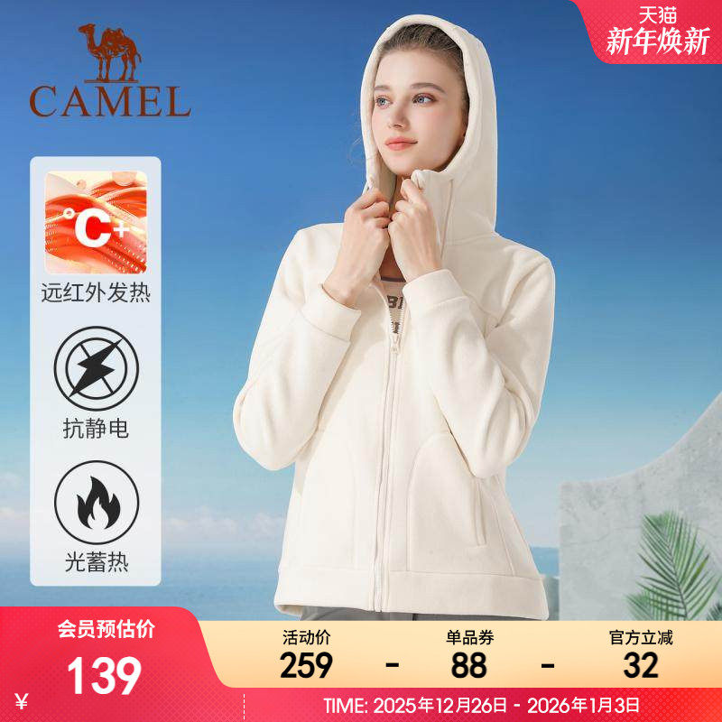 骆驼瑜伽外套女秋季加绒宽松休闲防风连帽运动服修身保暖针织外套