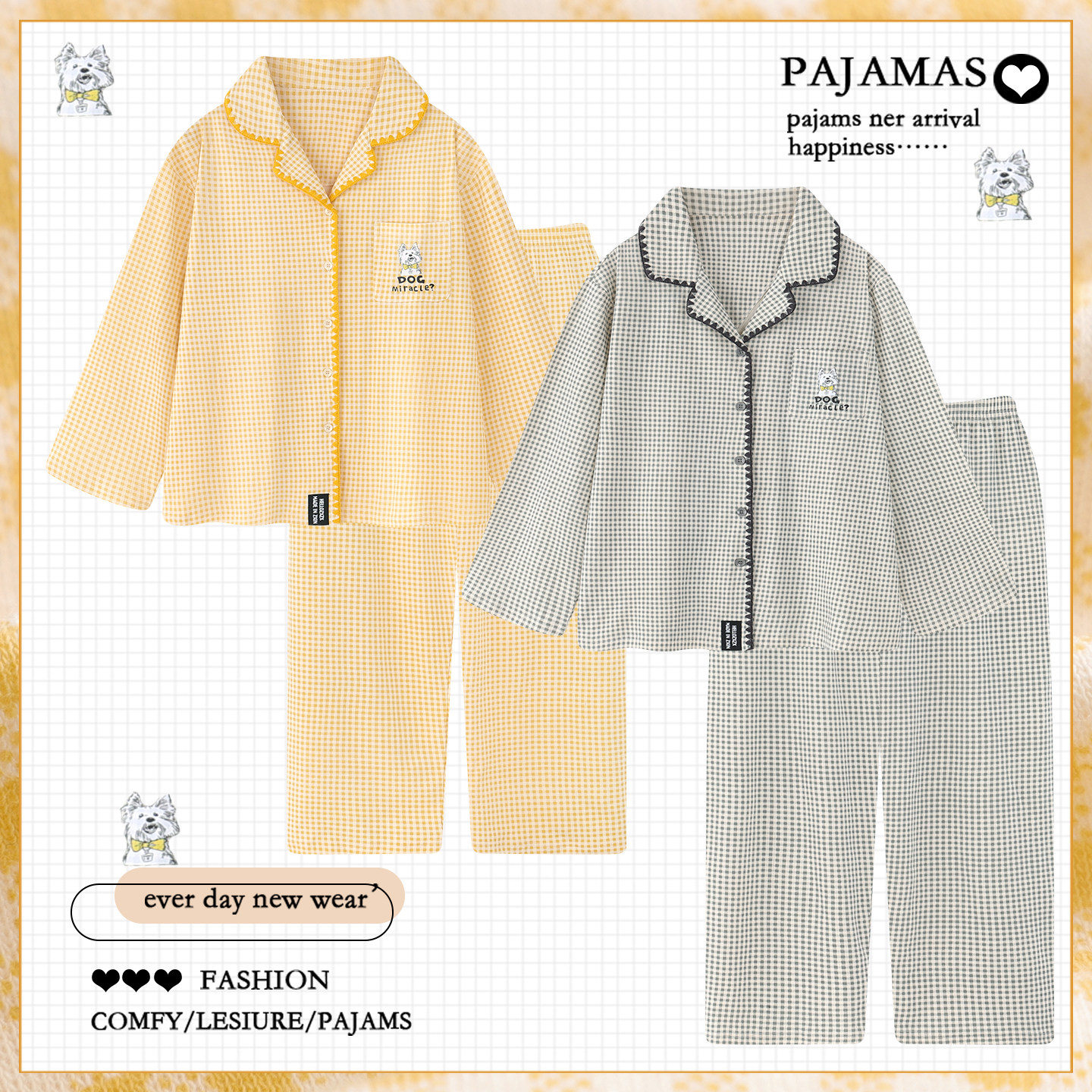 『吃番茄の狗』时尚卡通格纹情侣睡衣女春秋男长袖带胸垫家居服套