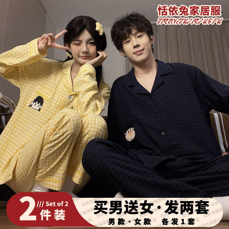 2025新款卡通格子纯棉睡衣情侣装一男一女春秋冬款长袖家居服套装