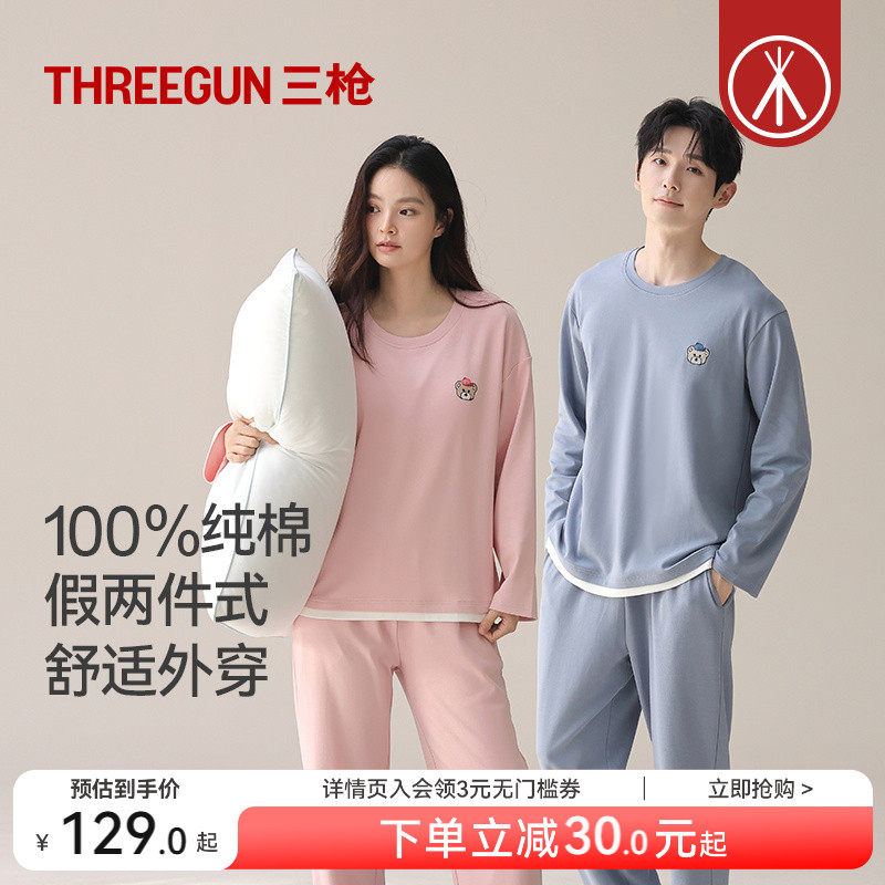 三枪秋季情侣假两件式可外穿纯棉睡衣男士卡通长袖超柔软家居服女