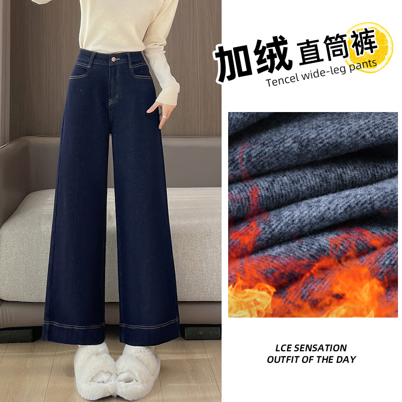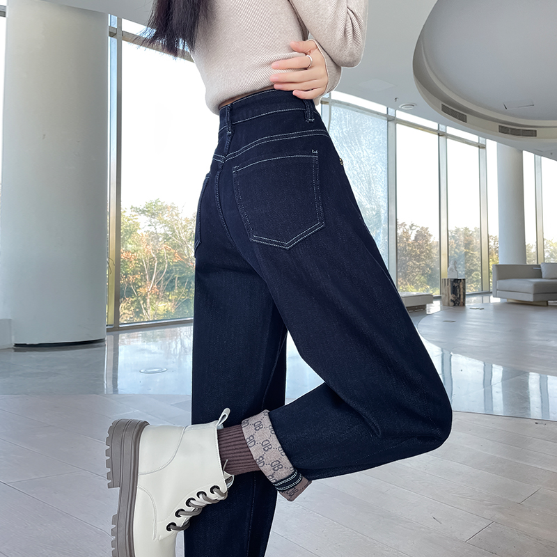 高级感深蓝色阔腿直筒牛仔裤女秋冬百搭宽松显瘦抓绒卷边气质长裤