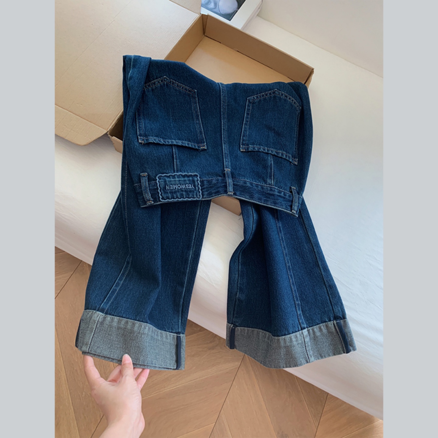 深蓝色卷边牛仔裤女秋冬新款胖mm大码高腰宽松显瘦直筒阔腿长裤子