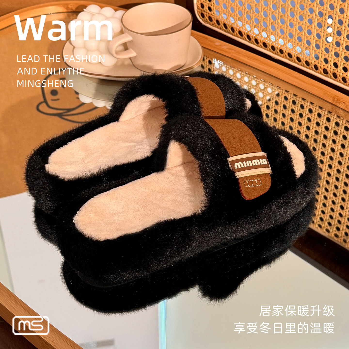 2025年新款毛毛拖鞋女外穿韩版ins潮鞋秋冬季简约厚底棉拖鞋一字