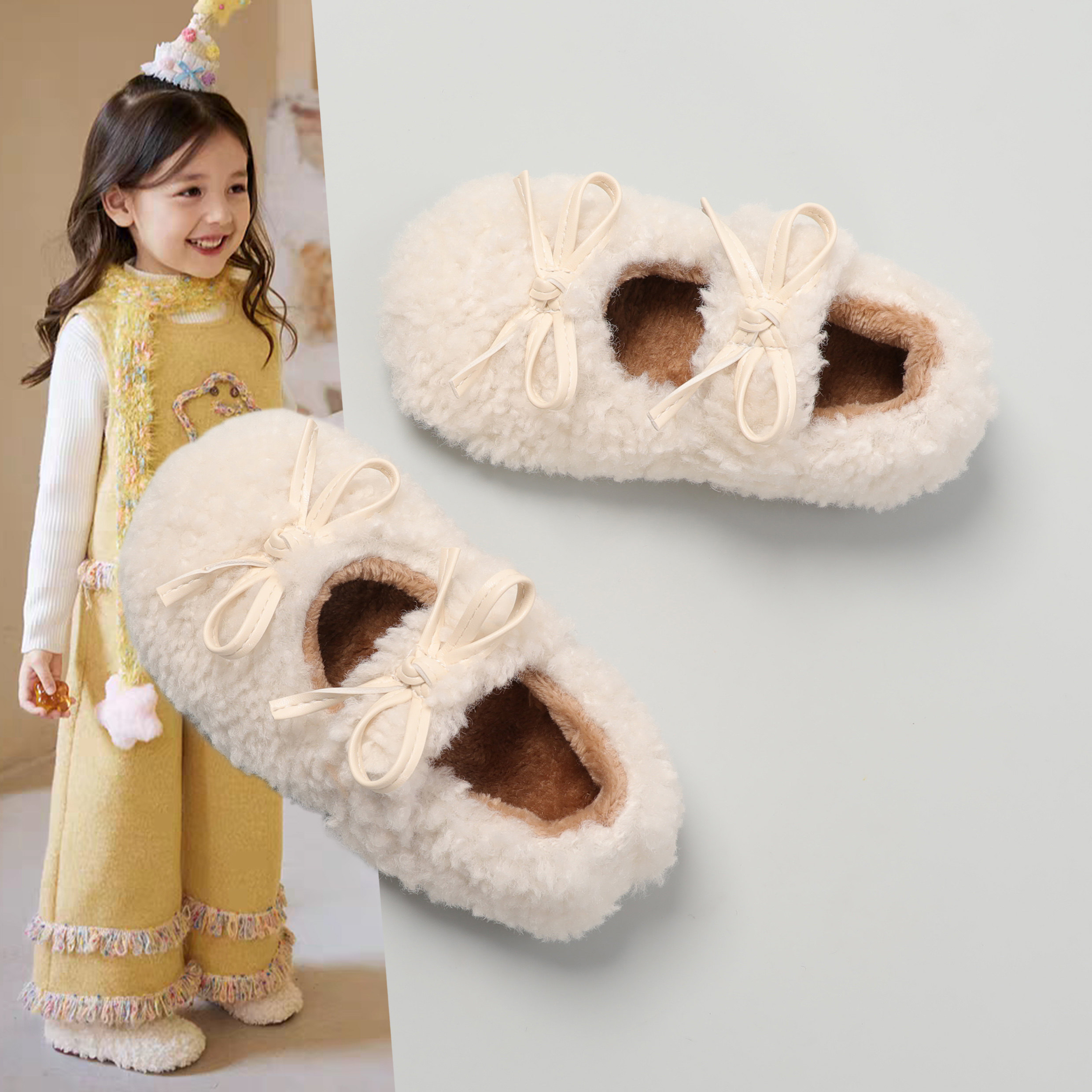 ABC儿童韩版毛毛鞋2025冬季新款女童蝴蝶结公主鞋软底保暖豆豆鞋
