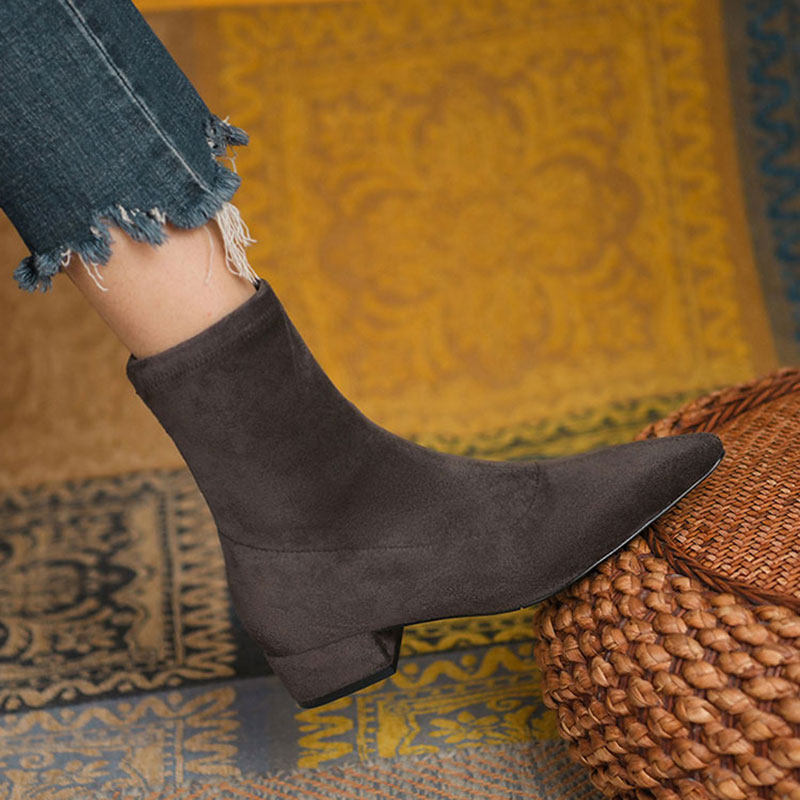 2025秋冬新款短靴女磨砂皮中跟粗跟短筒裸靴绒面尖头拉链加绒女鞋