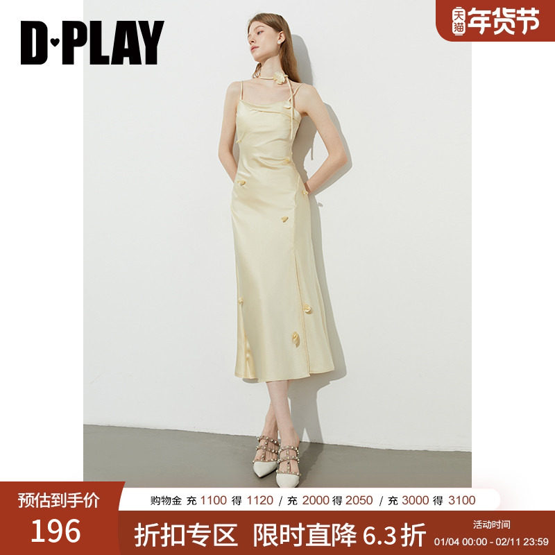 DPLAY【惠品】2025年夏季新款黄色连衣裙女度假吊带裙子缎面长裙