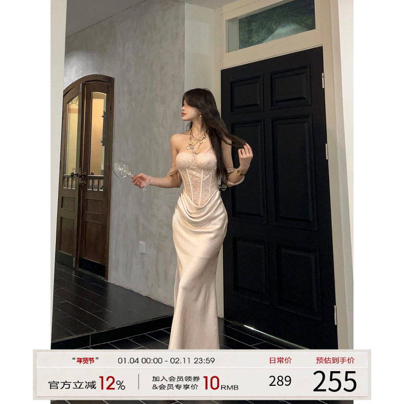 灰尘邓邓 千金感吊带连衣裙女2025冬季新款包臀长裙生日穿搭裙子