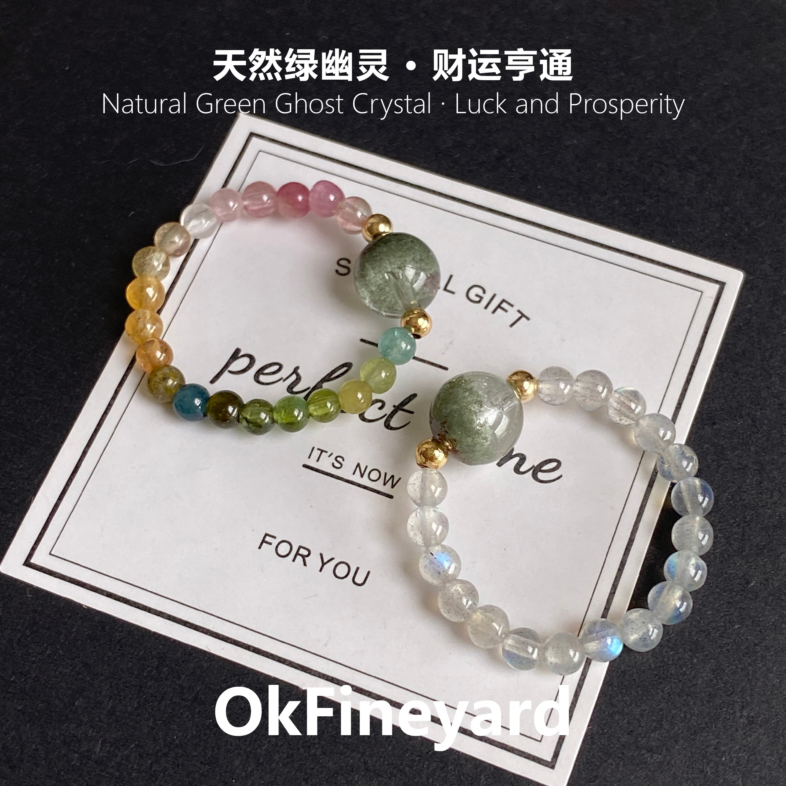 OkFineyard天然绿幽灵招财戒指女金发晶旺财运水晶串珠食指环尾戒