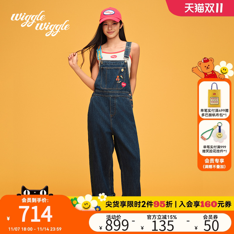 【齐思钧同款】wigglewiggle爱心熊牛仔裤撞色直筒阔腿裤背带裤女