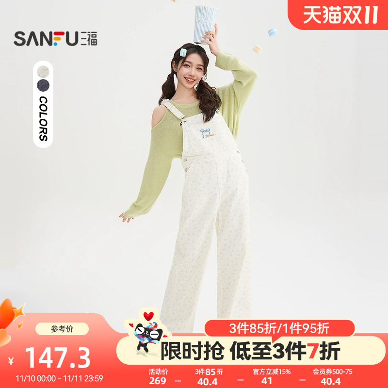 三福连身裤2025秋季蝴蝶结刺绣可调肩带连体裤背带裤女装509536