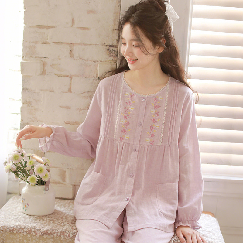 蔓秋日系甜美风纯棉纱布睡衣女春夏刺绣防凸点长袖家居服套装外穿