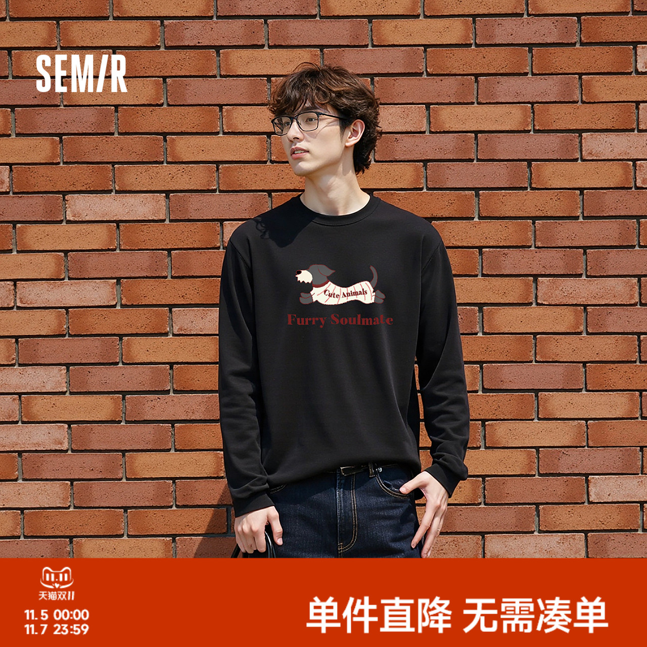 森马长袖T恤男秋季萌宠印花内搭2025新款美式情侣装休闲打底上衣