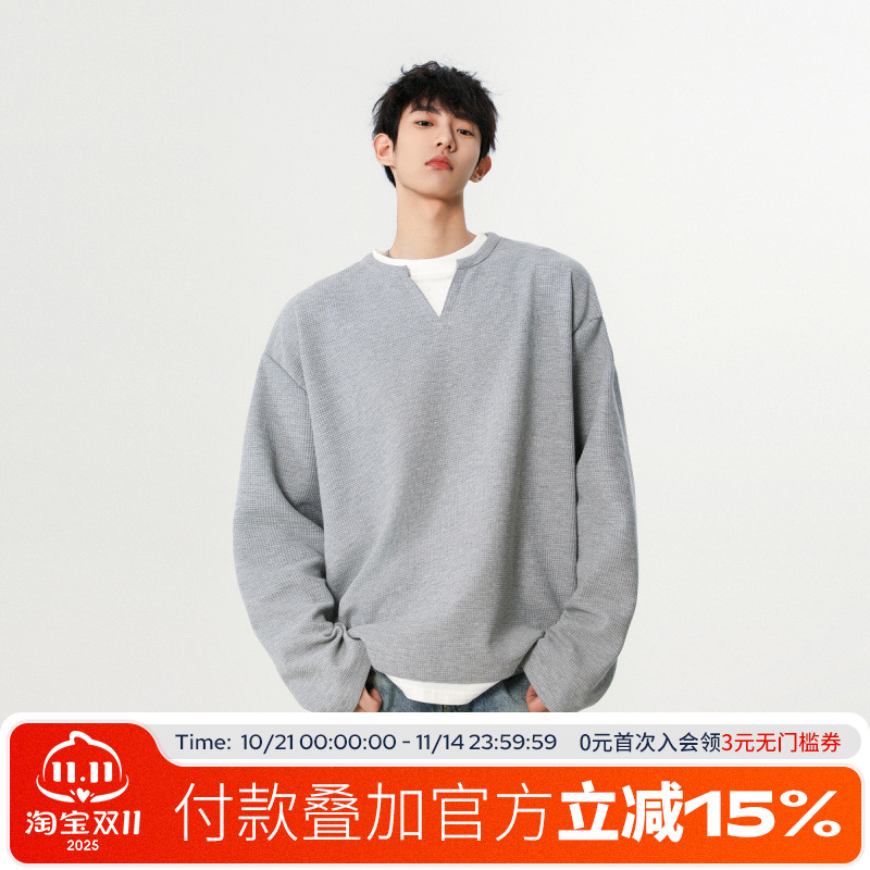FOFWMODE 秋季美式华夫格纯色假两件长袖T恤男宽松情侣款休闲TEE
