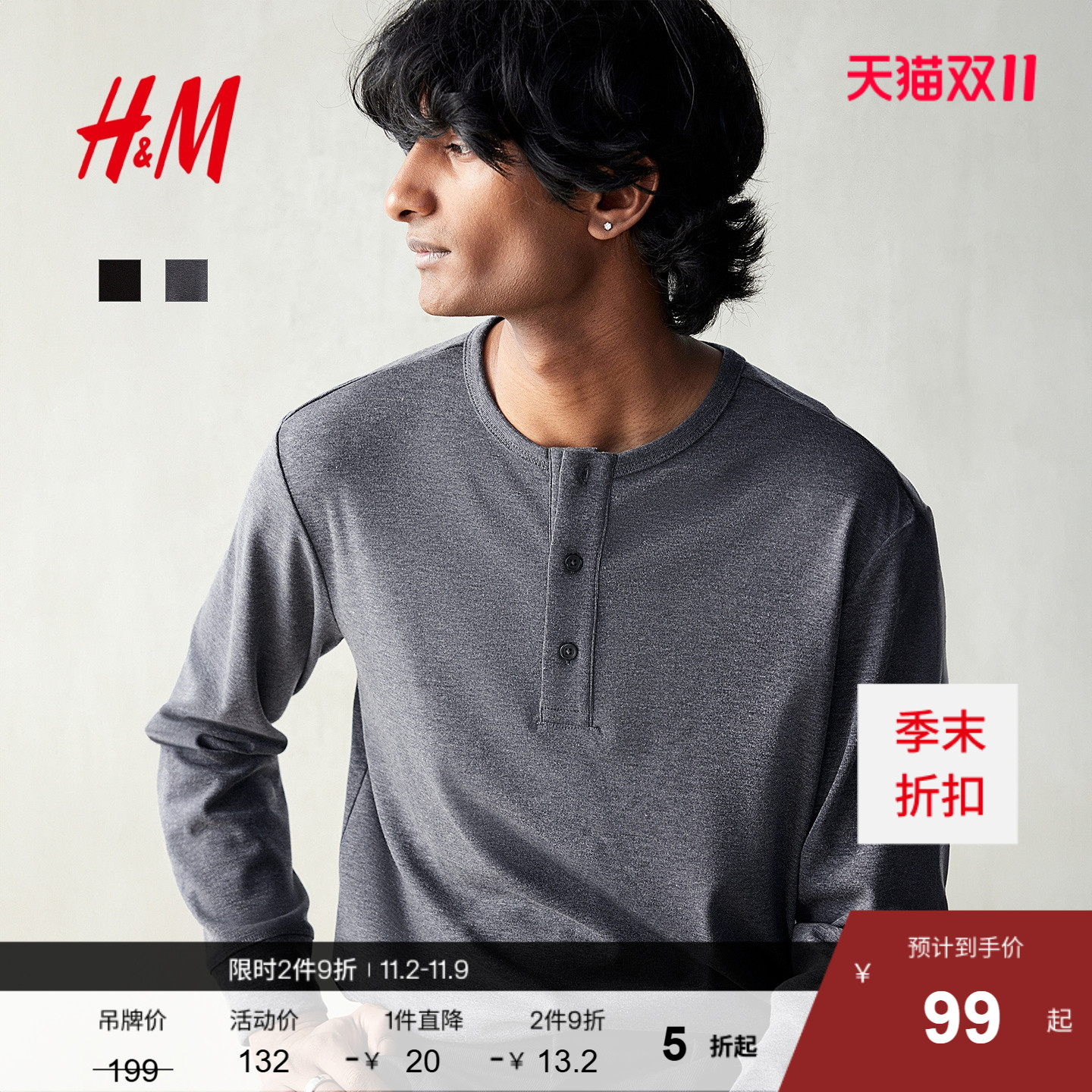 HM男装女装T恤秋季时尚休闲圆领纽扣门襟长袖亨利情侣上衣1266983