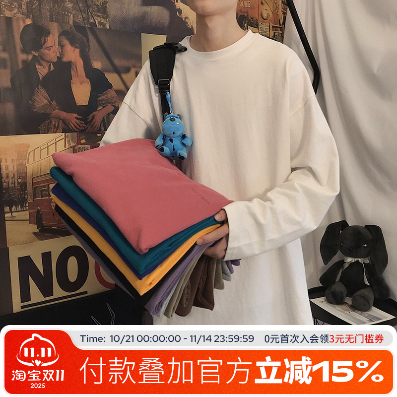 方少男春秋季男女纯色长袖T恤宽松情侣上衣内搭休闲圆领打底衫潮