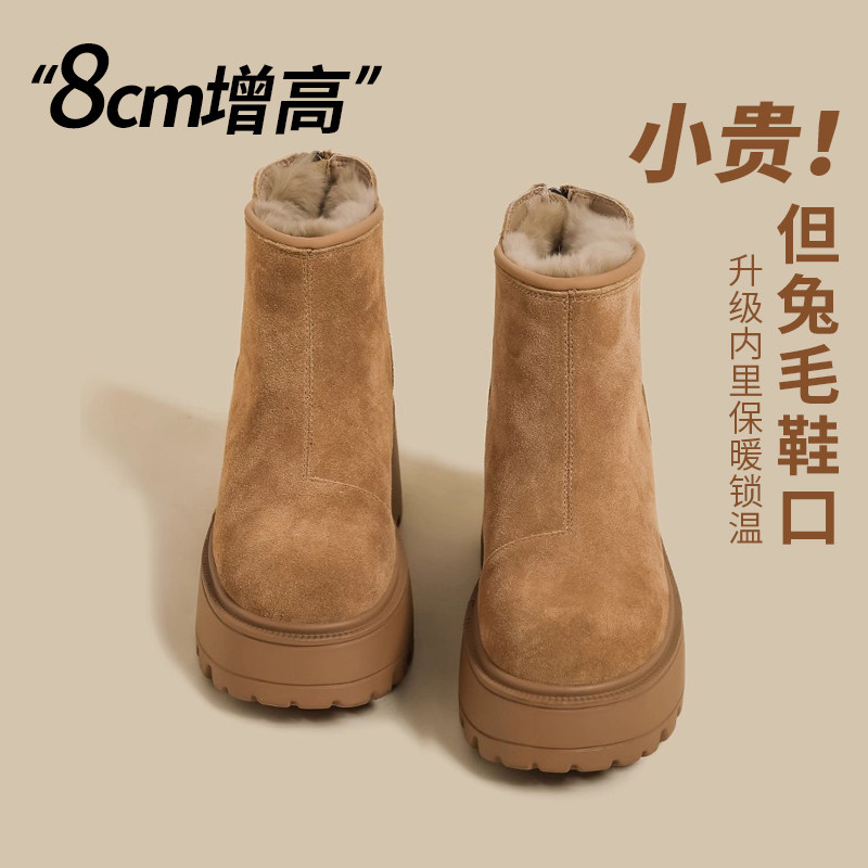 兔毛厚底雪地靴女外穿2025新款冬季真皮加绒增高勃肯鞋保暖棉鞋子