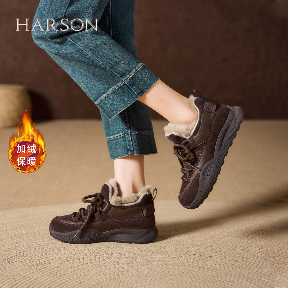 哈森复古厚底保暖兔毛休闲鞋女冬季爆款加绒舒适软底运动鞋德训鞋