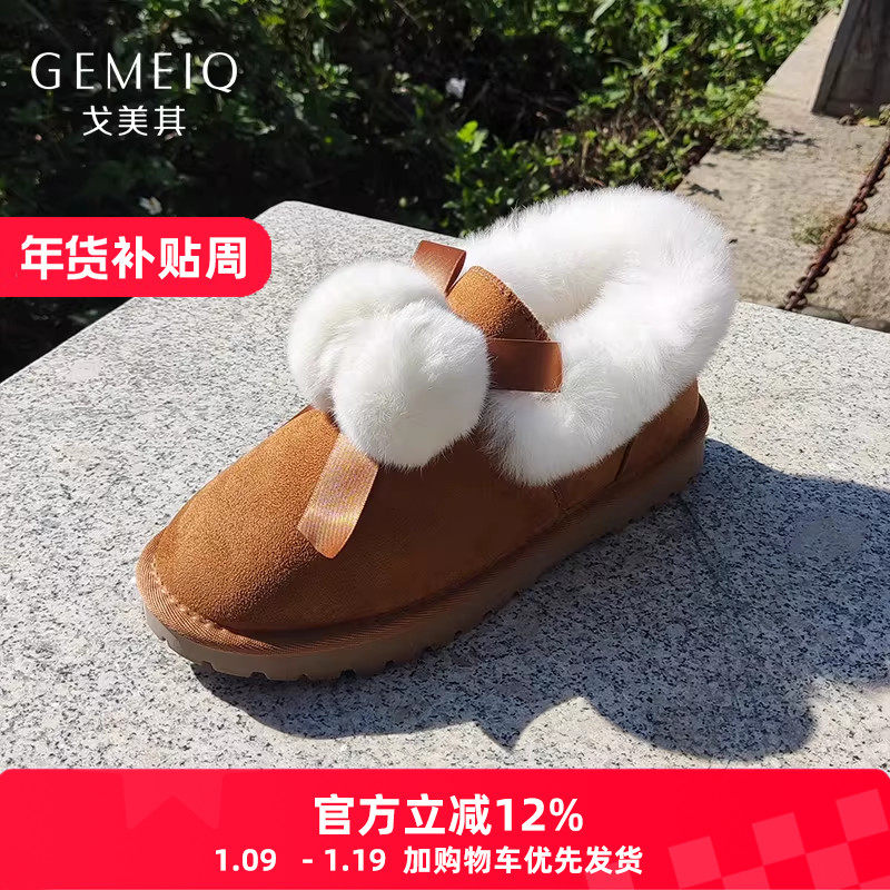 戈美其冬女鞋毛球低帮厚绒毛绒雪地靴保暖加绒棉鞋厚底真兔毛短靴