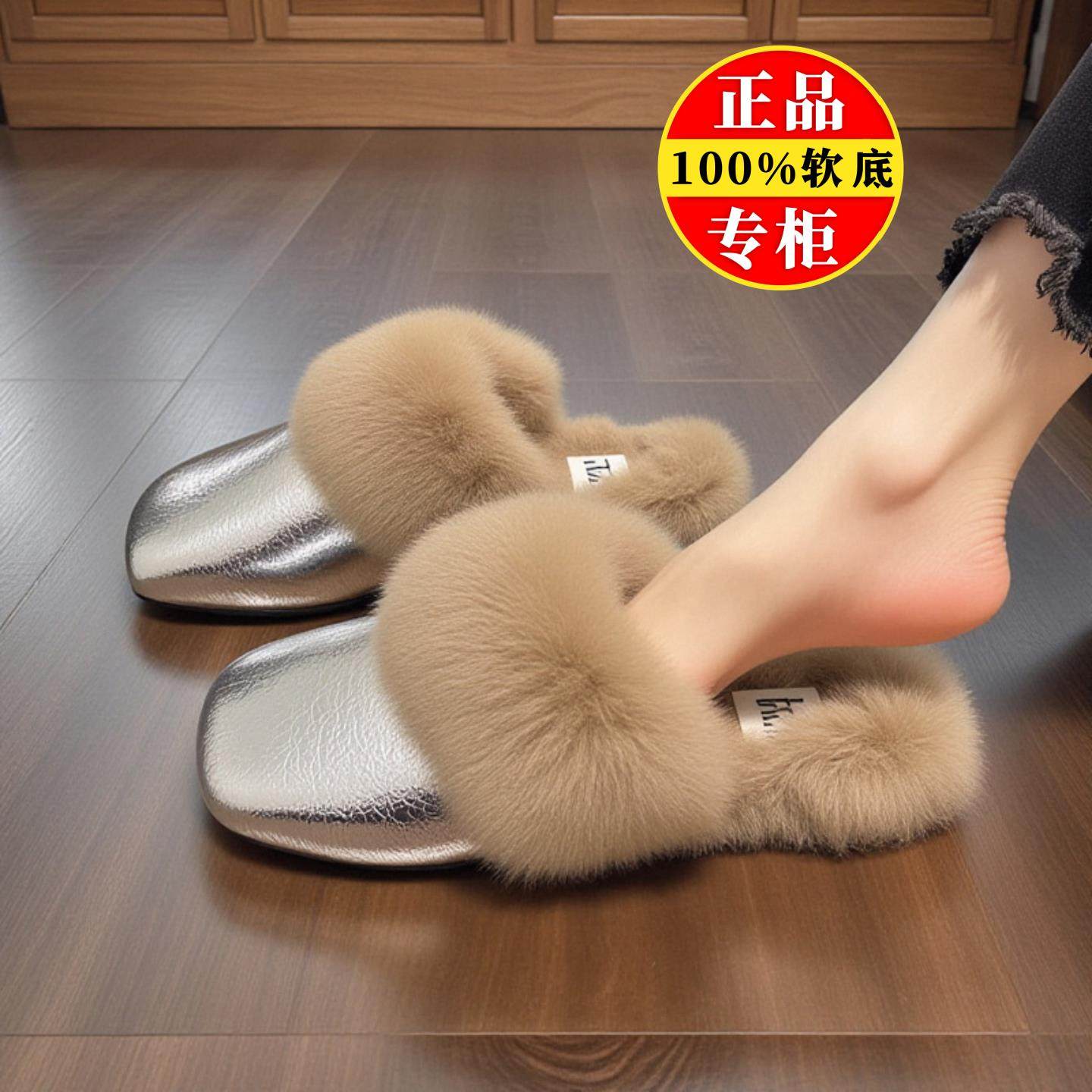 品牌真兔毛女鞋平底毛毛拖鞋女2025年新款冬季加绒包头拖软底棉拖