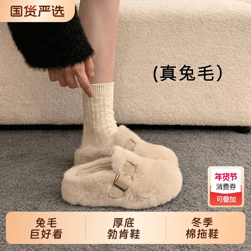 兔毛巨好看厚底勃肯鞋毛毛拖鞋包头半拖女外穿2025新款冬季棉拖鞋