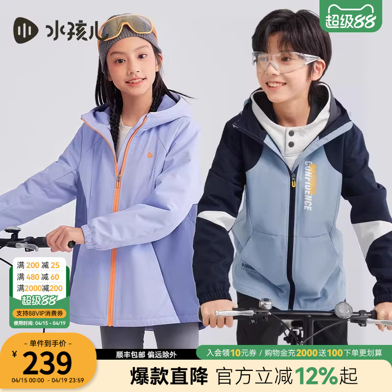 水孩儿儿童外套女童春秋装新品中大童三防风衣男童薄绒透湿连帽衫