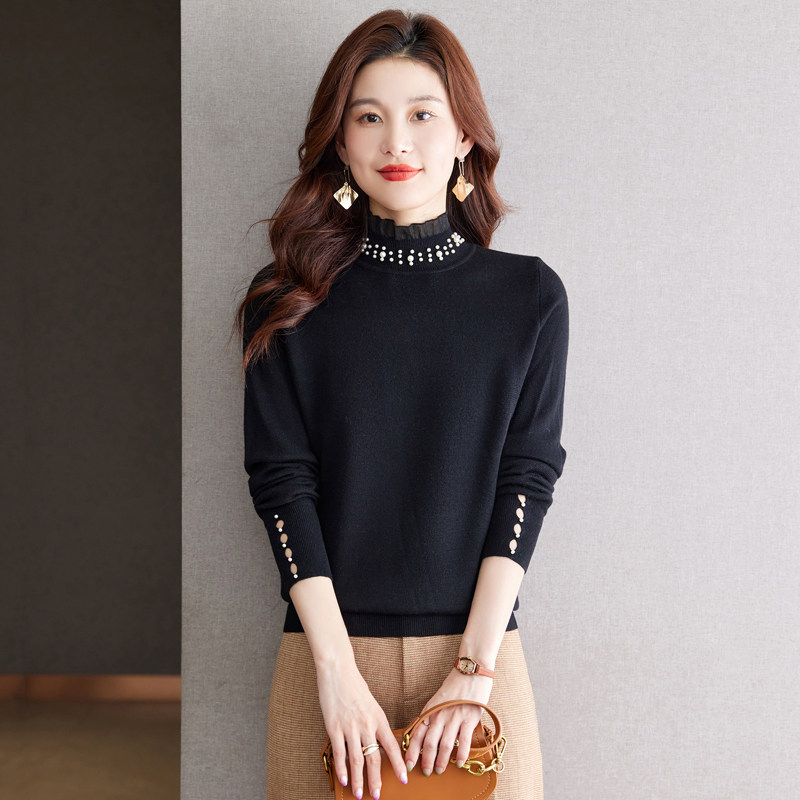 黑色毛衣打底衫女2025新款秋冬季小个子半高领套头宽松钉珠针织衫