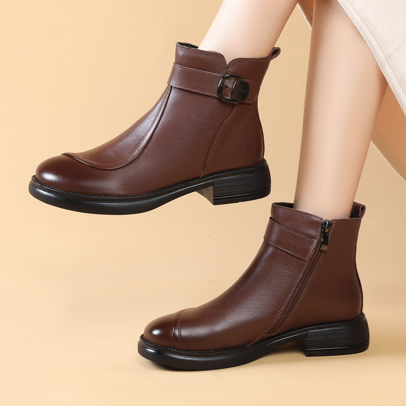 真皮平跟短靴女2025秋冬新款圆头单靴百搭低跟马丁靴显瘦加绒女靴