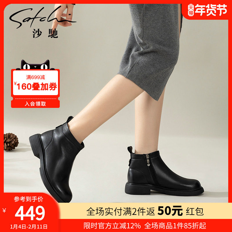 沙驰女鞋平跟羊皮革时装靴短靴2025年冬季新款通勤百搭短筒女靴子
