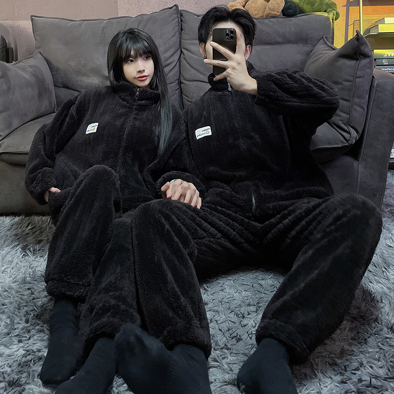 睡衣大码情侣珊瑚绒冬季保暖拉链立领纯色加肥加大男女家居服套装
