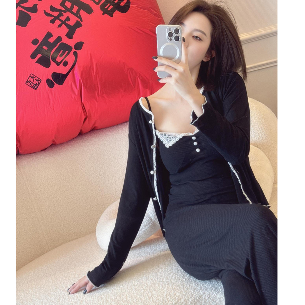 韩系新款ins风春秋睡衣少女黑色高级蕾丝边性感吊带三件套家居服