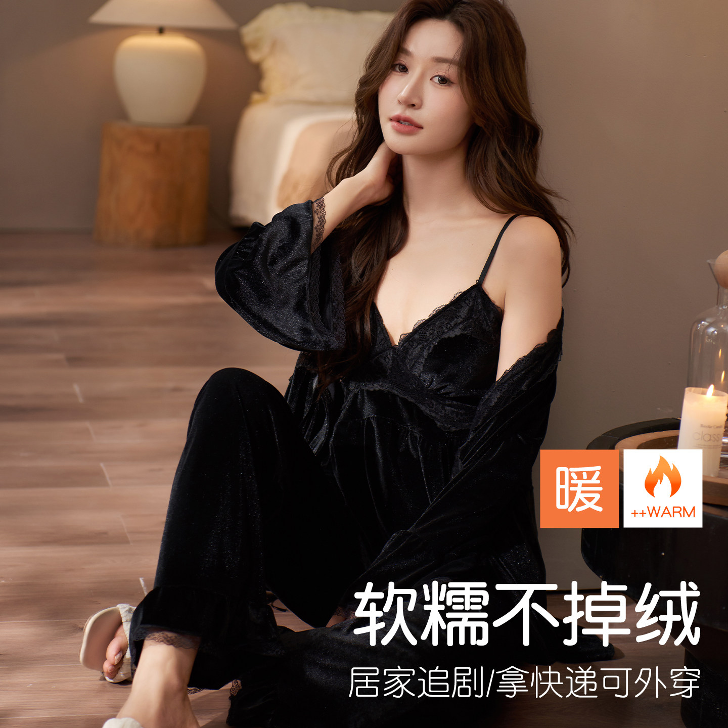 乐姿梦金钻绒睡衣女秋冬季性感黑色轻奢高级感可外穿家居服三件套