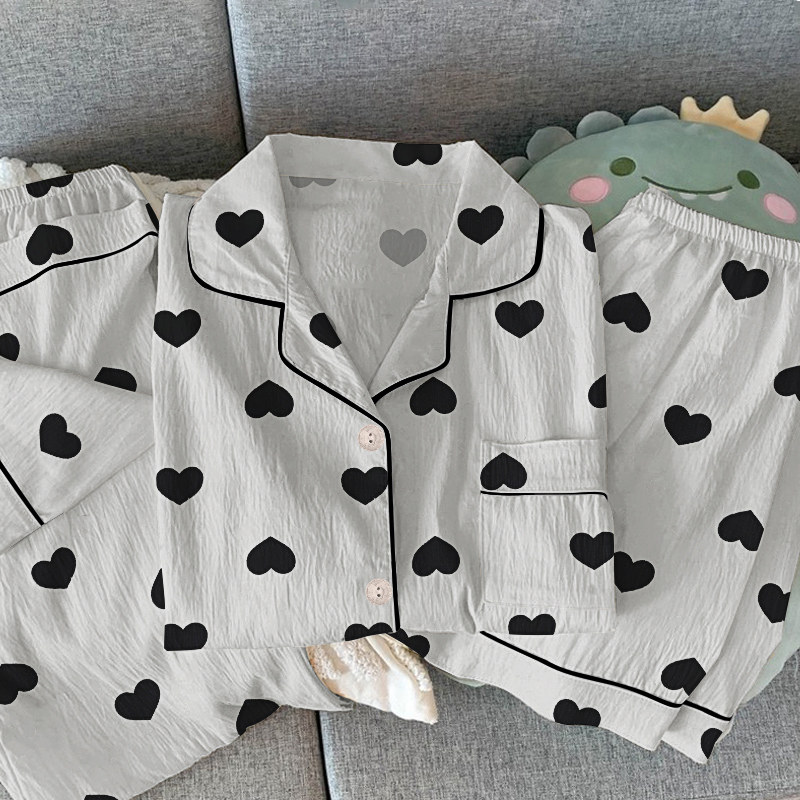韩版ins风简约休闲黑色爱心印花绉布睡衣女短袖长裤三件套家居服