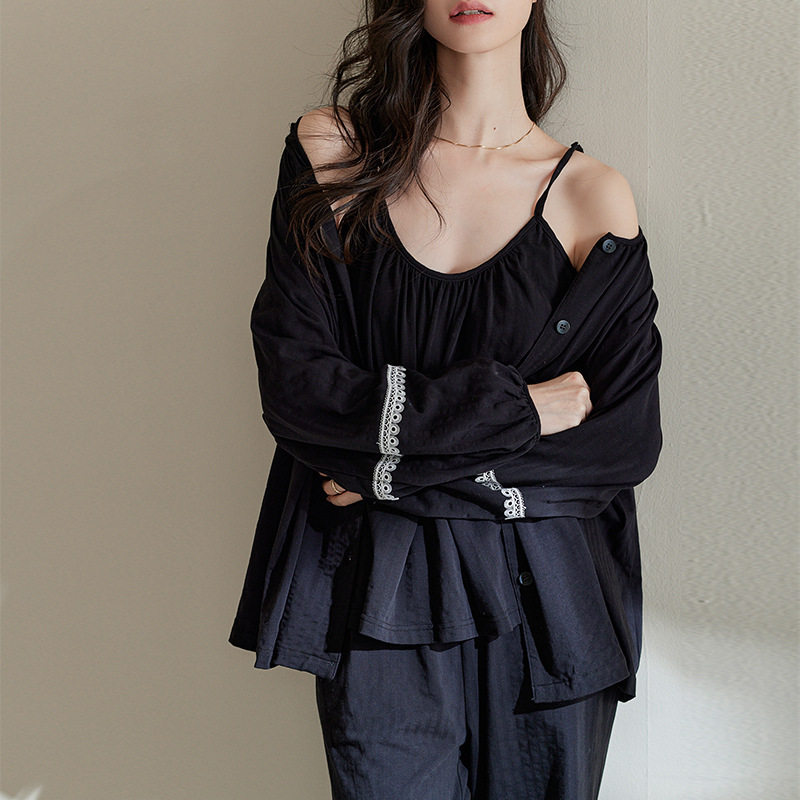 高级感黑色轻奢纯棉三件套睡衣女吊带+外披+长裤亲肤舒服四季可穿